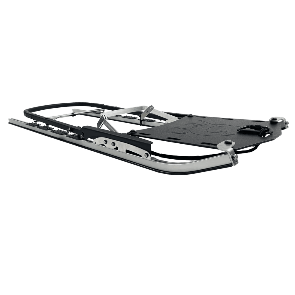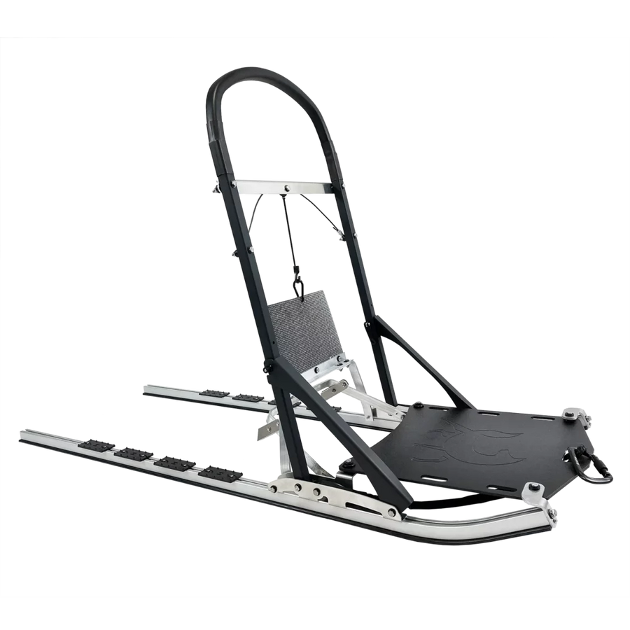 Le modèle de base inclut un mousqueton 5 000 lb à l'avant pour attacher le système de cordage et un frein qui permet d'arrêter la trottinette des neiges très rapidement et de la maintenir en place lorsque vous êtes à l'arrêt et que les chiens veulent repartir.