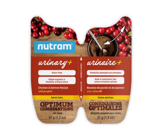 Eau, poulet, saumon, produit de poudre d’œufs, amidon de tapioca, citrouille, extrait de poisson, chlorure de choline, Vitamines (supplément de vitamine E, supplément de niacine, mononitrâtes de thiamine, supplément de vitamine A, supplément de vitamine B12, supplément de vitamine D3, pantothénate de calcium, supplément de riboflavine, chlorhydrate de pyridoxine, supplément de biotine, acide folique, bisulfite de sodium et de ménadione), minéraux (oxyde de zinc, fer réduit, sélénite de sodium, monohydrate de sulfate de manganèse, complexe de glycine de cuivre, iodure de potassium), extrait de canneberge, poudre de céleri, taurine, chlorure de potassium.