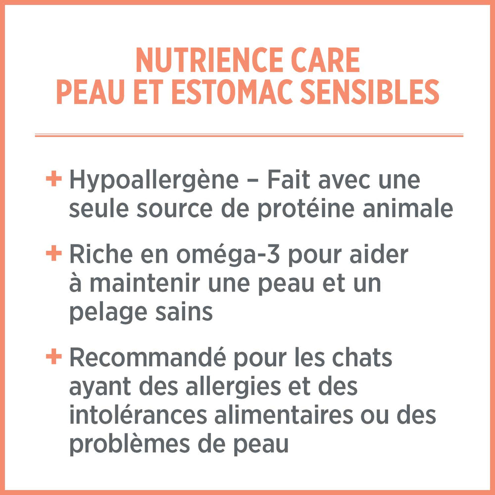 Ingrédients : Saumon, poisson océanique, bouillon de saumon, protéine de pois, patates douces, farine de luzerne séchée au soleil, pois, carbonate de calcium, graines de lin, agar-agar, lentilles, huile de saumon, huile de colza, phosphate tricalcique, pois chiches, lécithine, chlorure de choline, sel, extrait de Yucca schidigera, fibre de pois, taurine, chlorure de potassium, varech séché, L-ascorbyle-2-polyphosphate (source de vitamine C), protéinate de zinc, supplément de vitamine E, sulfate ferreux, protéinate de fer, sulfate de zinc, supplément de niacine, mononitrate de thiamine, inuline, graines de chia, gingembre, aloès officinal, pomme, avocat, bleuet, caroube, carotte, camomille, canneberge, graines de fenouil, thé vert, chou frisé, souci, papaye, paprika, persil, grenade, citrouille, romarin, spiruline, thym, tomate, curcuma, épinard, protéinate de cuivre, supplément de vitamine A, protéinate de manganèse, pantothénate de calcium, chlorhydrate de pyridoxine, supplément de riboflavine, sélénite de sodium, sulfate de manganèse, supplément de vitamine D3, supplément de vitamine B12, iodate de calcium, biotine, acide folique.