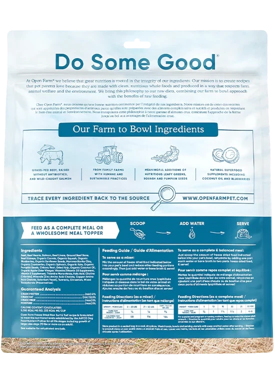 Bœuf élevé dans des conditions humaines, cœurs de bœuf, saumon sauvage du Pacifique, rognons de bœuf, foies de bœuf, os de bœuf haché, carottes biologiques, courges biologiques, bleuets biologiques, graines de tournesol biologiques, argile montmorillonite, canneberges biologiques, épinards biologiques, chou frisé biologique, graines de citrouille biologiques, racine de chicorée, graines de fenugrec, Huile de noix de coco non OGM, huile de saumon, varech séché, vinaigre de cidre de pomme biologique, supplément de vitamine D3, supplément de vitamine A, supplément de riboflavine, supplément de vitamine D3, supplément de vitamine E, mononitrate de thiamine, acide folique, choline, chélate d'acide aminé de zinc, chélate d'acide aminé de cuivre, levure de sélénium.