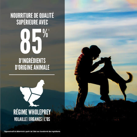 Poulet frais (25%), dinde crue (8%), abats de poulet frais (foie, cœur) (7%), hareng entier cru (6%), merlu entier cru (5%), œufs frais (5%), foie de dinde cru (5%), poulet déshydraté (4%), dinde déshydratée (4%), maquereau déshydraté (4%), sardine déshydratée (4%), hareng déshydraté (4%), lentilles rouges entières, pois chiches entiers, pois entiers , gras de poulet (3%), lentilles vertes entières, haricots Pinto entiers, haricots entiers, fibres de lentilles, huile de goberge (1%), amidon de pois, varech séché, citrouille entière fraîche, courge musquée entière fraîche, courgette entière fraîche, carottes entières fraîches, pommes entières fraîches, poires entières fraîches, racine de chicorée, chou frisé frais, épinards frais, feuilles de betteraves fraîches, feuilles de navet fraîches, canneberges entières, bleuets entiers, baies de Saskatoon entières, curcuma, chardon marie, racine de bardane, lavande, racine de guimauve, fruits de l’églantier