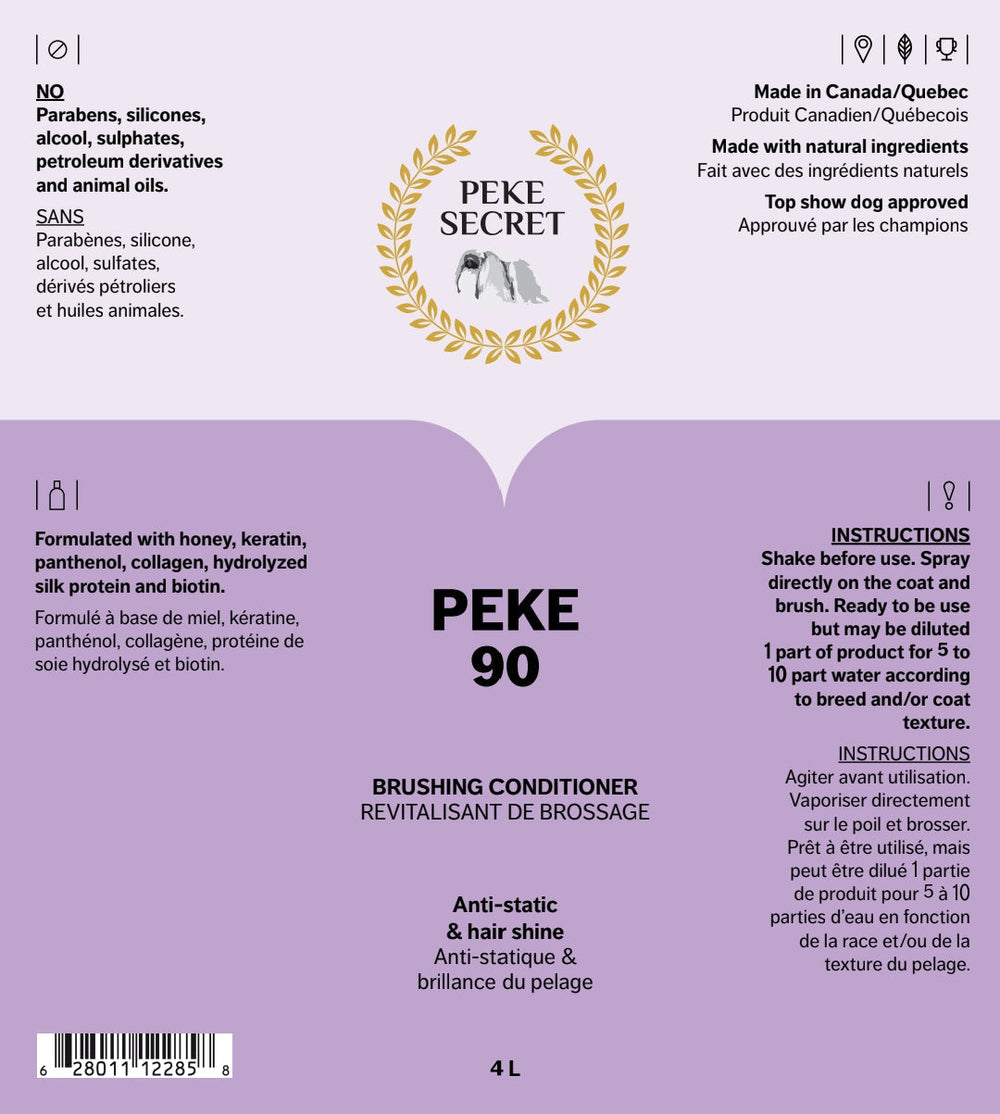 Le revitalisant de brossage Peke 90 est un produit de toilettage qui aide à illuminer et conditionner le pelage tout en facilitant le brossage. Ce revitalisant a une action antistatique qui aide à la repousse du poil, tout en protégeant le pelage.