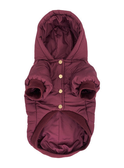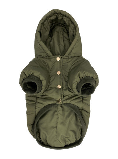 Ce manteau doublé possède un extérieur résistant à l'eau qui protégera votre chien des froids de l'hiver québécois. Sa fermeture munie de boutons pression en métal est facile à fermer et le cache-cou/cache-tête intégré gardera votre chien bien au chaud.