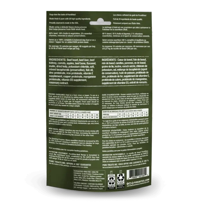 Les recettes lyophilisées de PureBites sont préparées avec seulement 20 ingrédients simples de qualité humaine, dont 80 % de bœuf pur, 18 % de carottes et de pommes et 2 % de vitamines essentielles, de minéraux et d’agents de conservation naturels.