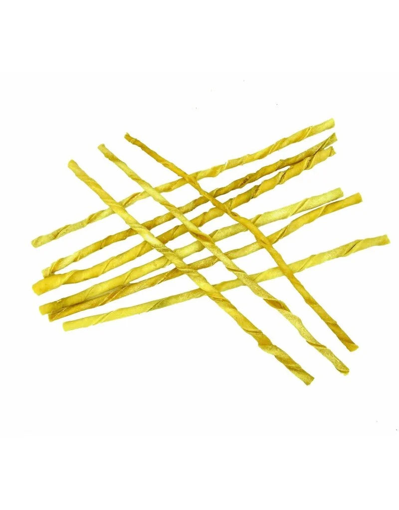 Les torsades de peau de buffle proviennent de buffles élevés sans hormones ou antibiotiques. Ces peaux sont cuites à des températures basses pour s'assurer d'une saveur maximale.