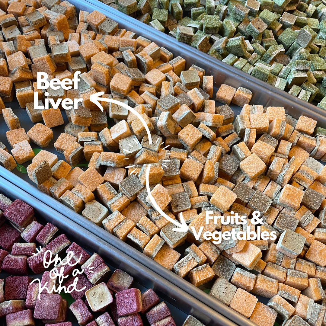 Ingrédients : foie de boeuf, citrouille, courge, banane, carottes, navets, panais, gélatine de boeuf
